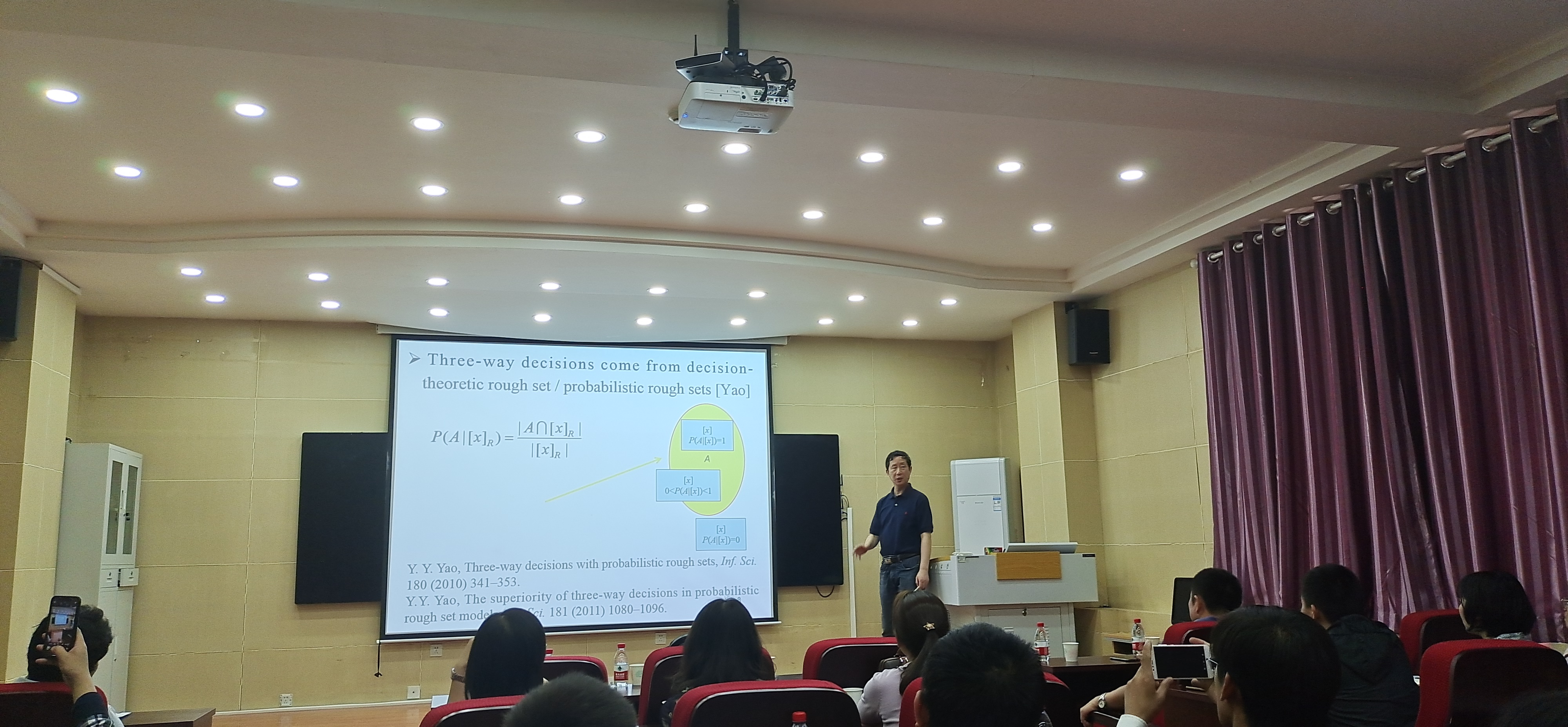 报告中,胡宝清教授首先详细介绍了三支决策理论及三支决策空间理论的引入背景;然后对三支决策空间理论在论域上的推广、公理上的推广、伪补上的推广以及决策评价函数的构造等给出了深入的讲解与分析;最后从三支决策空间理论背景研究出发,针对序结构上、格结构上和粒结构上的三支决策空间如何研究给出了若干可供进一步研究的不同视角。