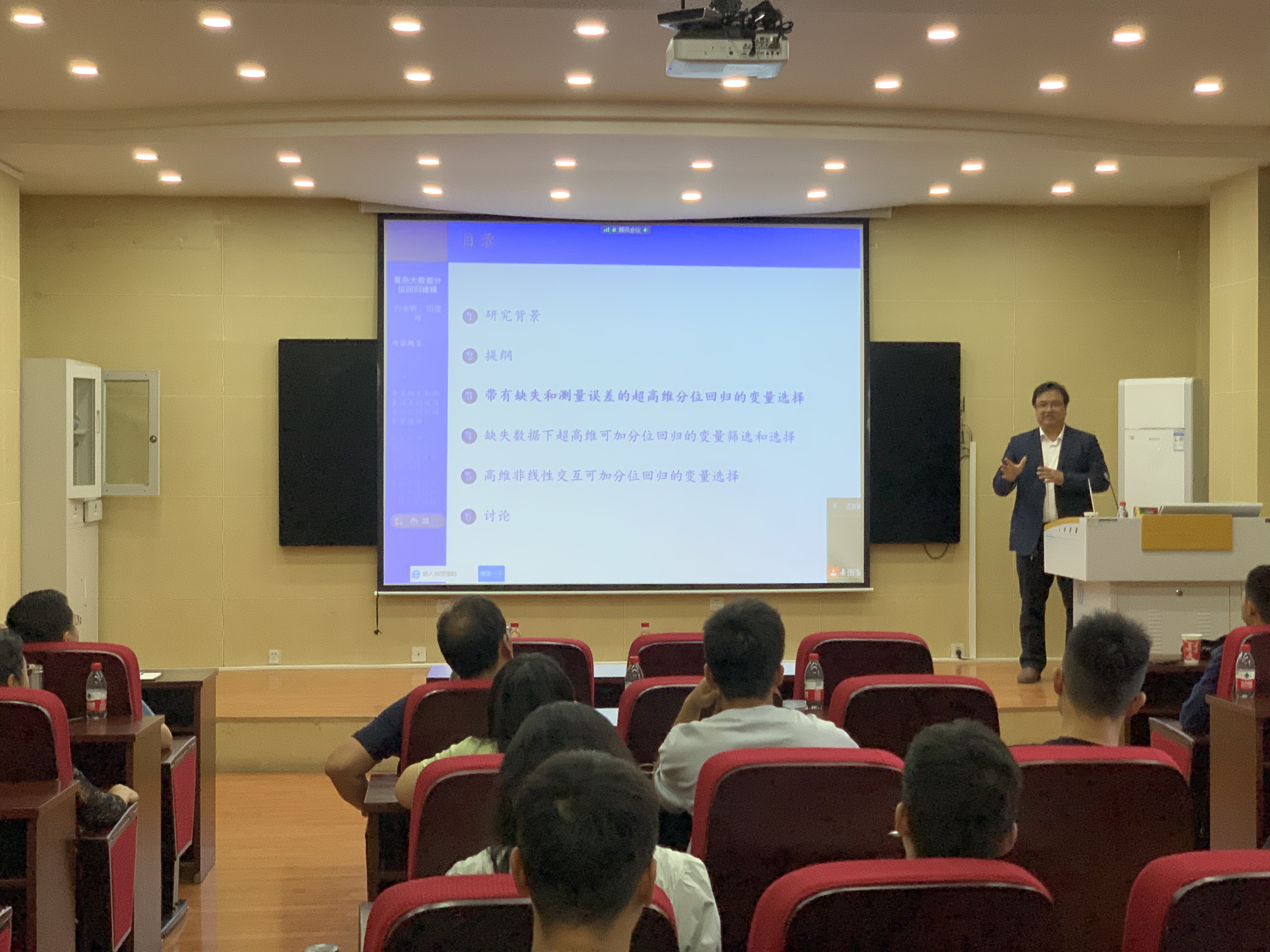 7月2日上午8点,中国人民大学统计学院田茂再教授做了第一场报告,题为《复杂大数据的分位回归建模》。报告会由田玉柱副教授主持,学院师生40余人参加。田教授首先介绍了分位回归方法,然后介绍了缺失、删失、测量误差及高维等复杂数据,并结合具体的非参数回归模型、可加模型以及交互效应的可加模型的分位回归估计介绍了变量选择问题。报告内容前沿且信息量大,引起了在场师生的广泛兴趣。报告会后,田教授与现场师生互动交流,就师生提出的问题进行了解答。