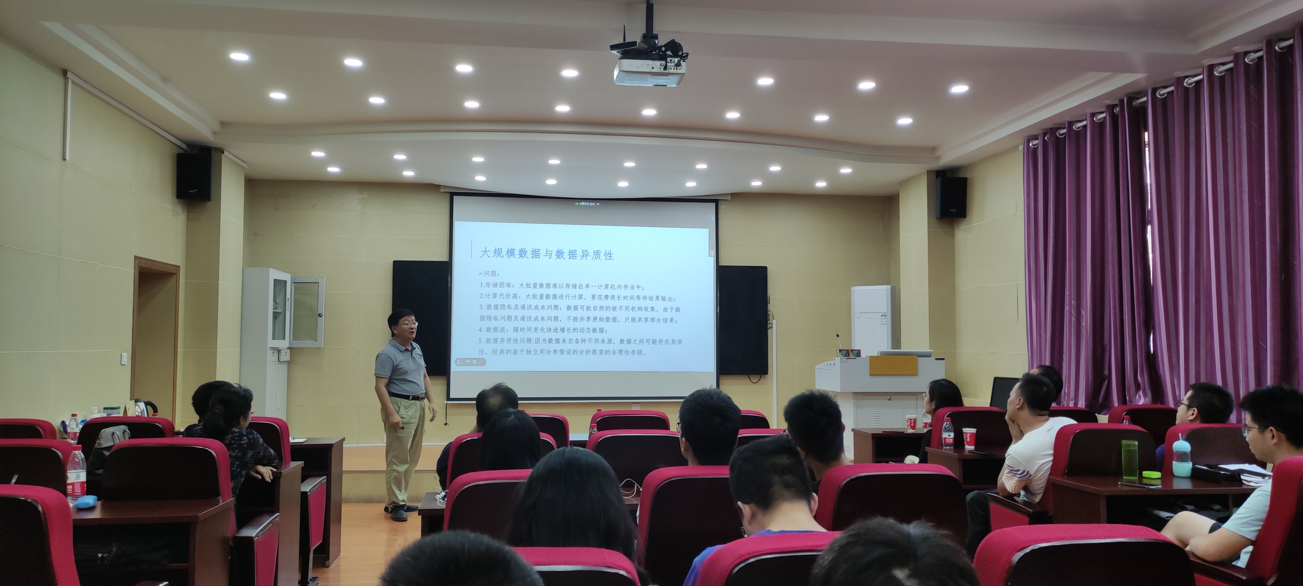 7月2日上午10点,中国科学院系统科学研究院研究员王启华教授做了第二场报告,题为《大数据时代呼唤统计:统计的新进展》。报告会由肖鸿民教授主持,学院领导及师生40余人参加。报告中,王教授针对目前流行的大数据问题以及大数据时代统计学面临的机遇和挑战进行了详细的介绍。大数据时代统计发展面临的主要挑战是数据的储存、计算问题、复杂的数据结构与数据异质性等问题。针对这些挑战,统计发展了一些新的推断方法,比如分布式推断、子抽样、在线推断及异质分析等方法。王教授的报告让学院师生对大数据时代统计学的发展与前沿有了更加充分的认识。报告内容丰富,现场气氛热烈。报告会结束后,王教授和现场师生进行了充分互动,回答了师生提出的一些问题。