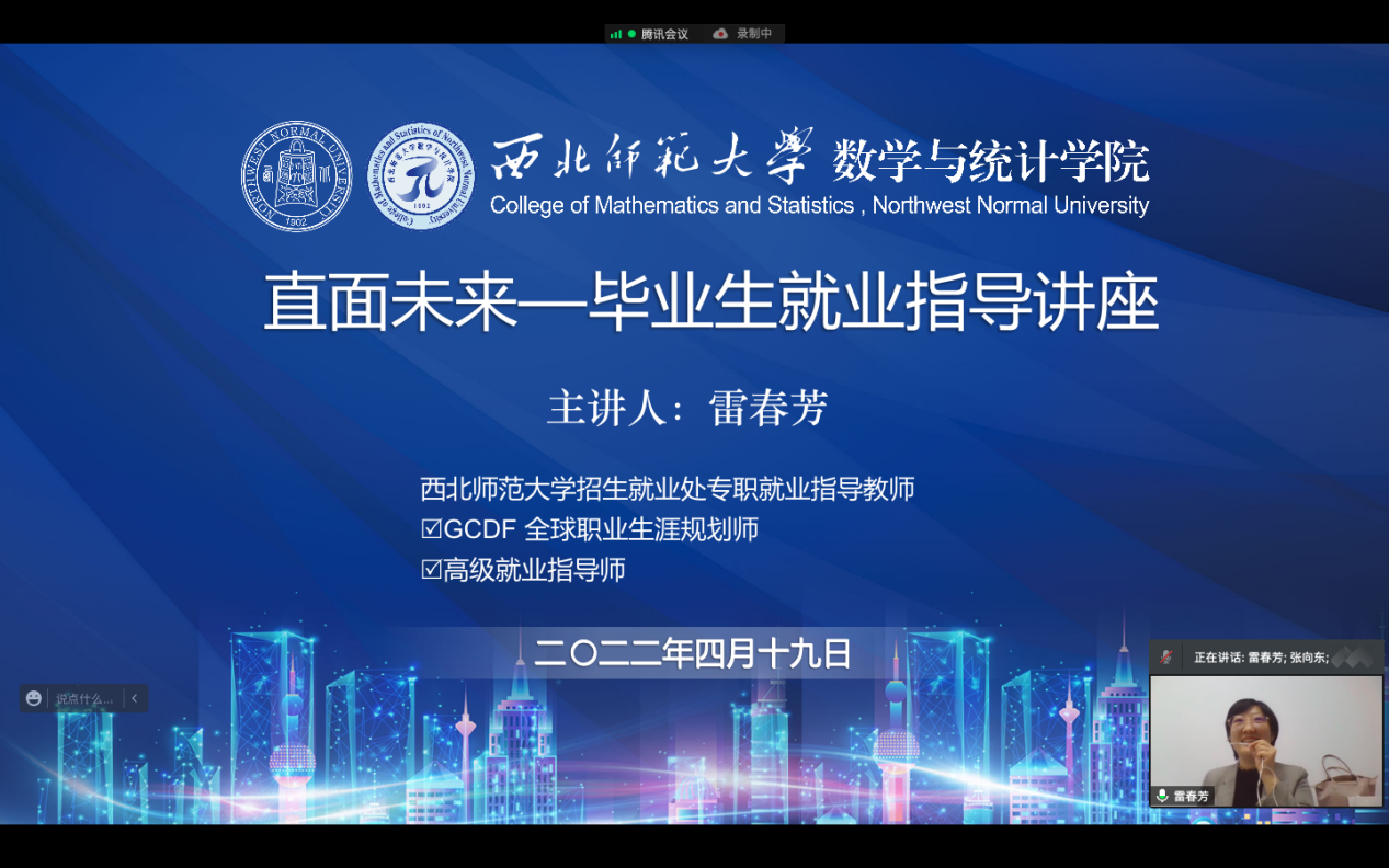 为更好地促进我院2022届毕业生高质量充分就业,进一步帮助学生树立正确的就业观和择业观,解决考研、就业中的困惑,了解目前的考研、就业形势、就业政策,转变就业观念,提高就业技能,4月19日晚,学院邀请英国365处专职就业指导教师雷春芳老师在腾讯会议做了题为《“三个重视”助力成功就业》的专题讲座,讲座由学院党委副书记张向东主持。