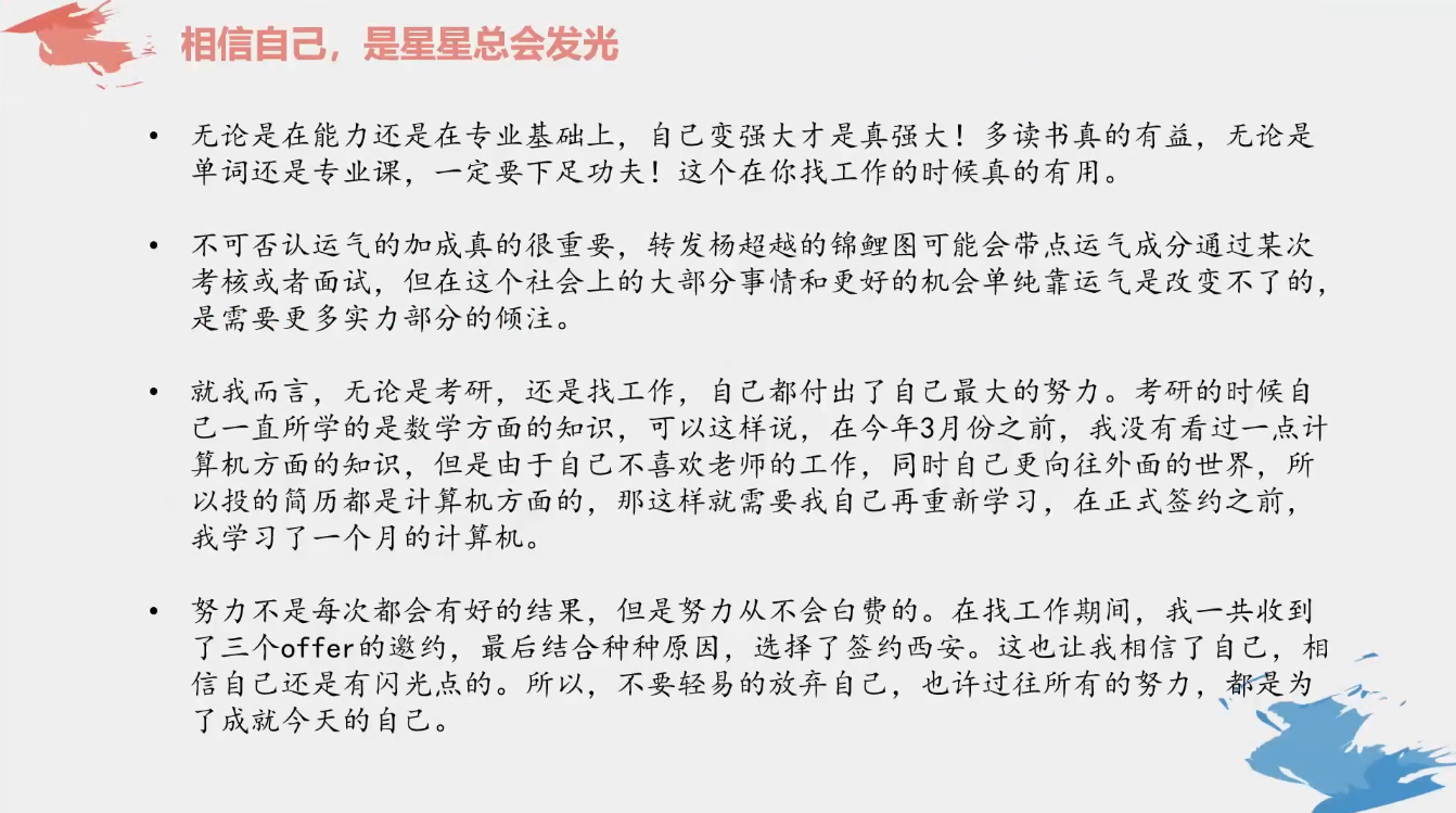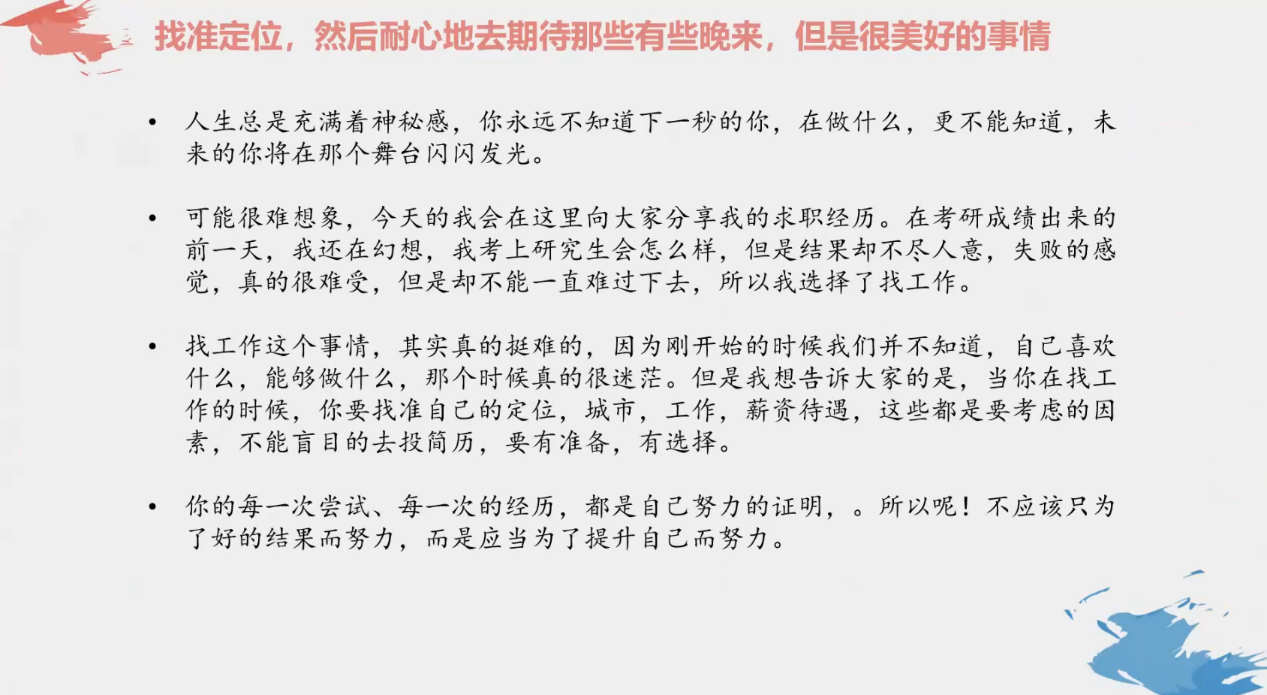 陈曦同学从个人求职经历、求职注意事项和求职心得三个方面为大家分享经验。他通过讲述自己在求职过程中的成功与失利,告诉同学们要提前想好升学还是就业,在大学期间要尽早考取需要的证书;就业不是升学失败的退路,选择就业不选择考研并不意味着自己不优秀,好的工作岗位也同样付出大量的时间精力去认真准备;机会对每个人都是平等的,建议大家要抓住每一个求职的机会,积极行动起来!