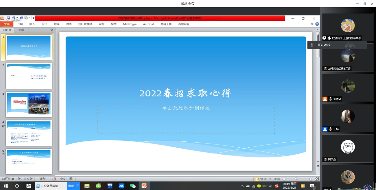 本期分享会为求职经验分享篇(一),于4月21日晚19:30在腾讯会议进行,学院分别邀请了2018级数学与应用数学3班陈曦、2018级信息与计算科学1班郭珂珂、段文文、王慧四位同学作为代表为学弟学妹们分享求职的心得与经验。