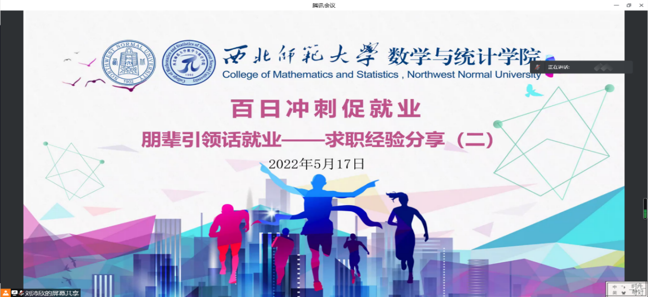 本期分享会为求职经验分享篇(二),于5月17日晚20:00在腾讯会议进行,学院分别邀请了2018级数学与应用数学1班魏莉杰、2018级数学与应用数学3班张欢欢、2018级数学与应用数学4班刘嘉琪三位同学作为代表为学弟学妹们分享求职的心得与经验。
