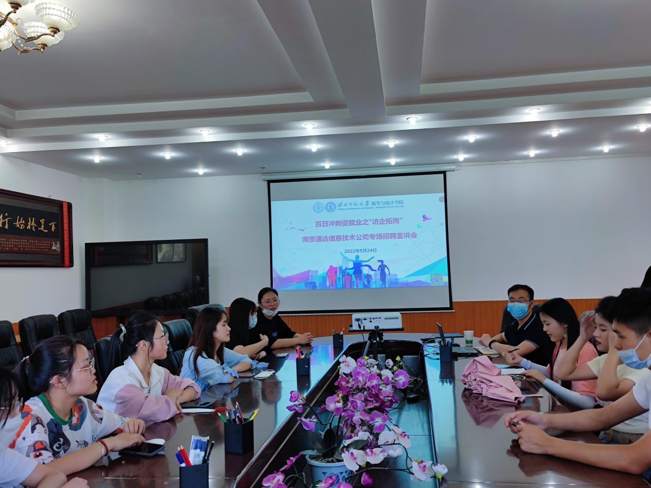 为贯彻落实党中央、国务院“稳就业”“保就业”决策部署,认真推进落实《英国上市3652022年毕业生就业市场开拓方案》,学院于2022年5月24日下午15:00在学院9B311会议室举行了南京通达信息技术公司线上专场招聘宣讲会。学院邀请了南京通达信息技术公司兰州分公司冯总经理进行线上宣讲,学院党委副书记张向东主持会议。
