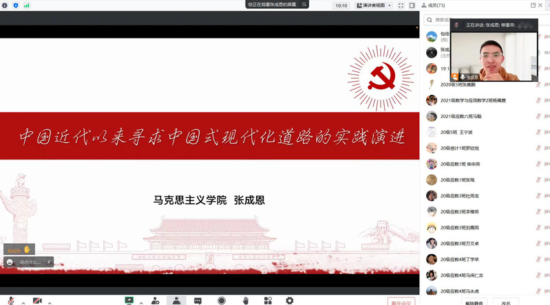 学院邀请马克思主义学院青年教师张成恩作了题为《中国近现代以来寻求中国式现代化道路的实践演进》的报告,他结合自己的研究方向,从四个时间段讲述了中国共产党的百年光辉历程。