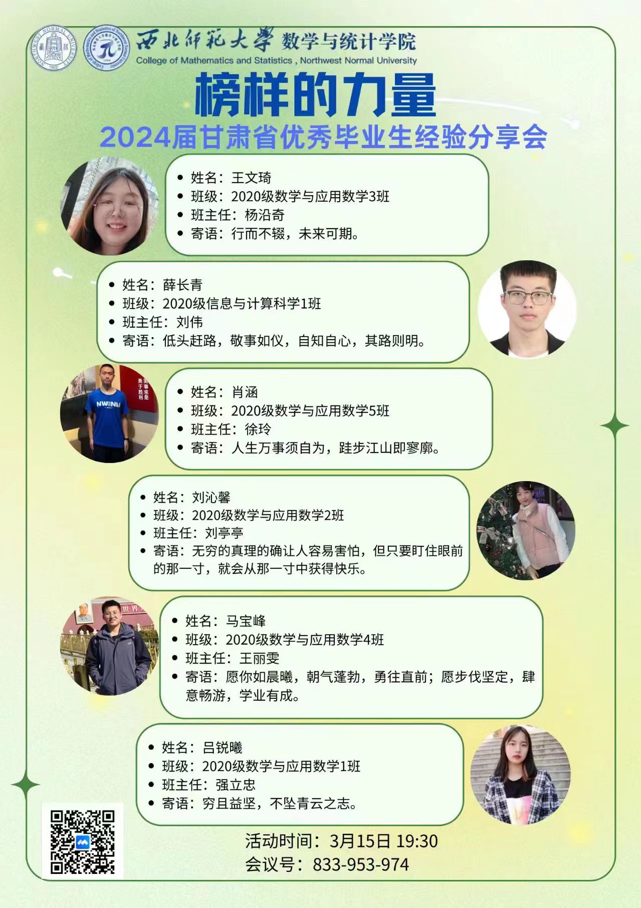 2024届甘肃省优秀毕业生王文琦、薛长青、肖涵、刘沁馨、马宝峰及吕锐曦结合自身经历,围绕学业成绩提升、相关竞赛经验、校园活动经历、实习实践方法等方面,细致地分享了如何突破自我、充实地度过大学时光。