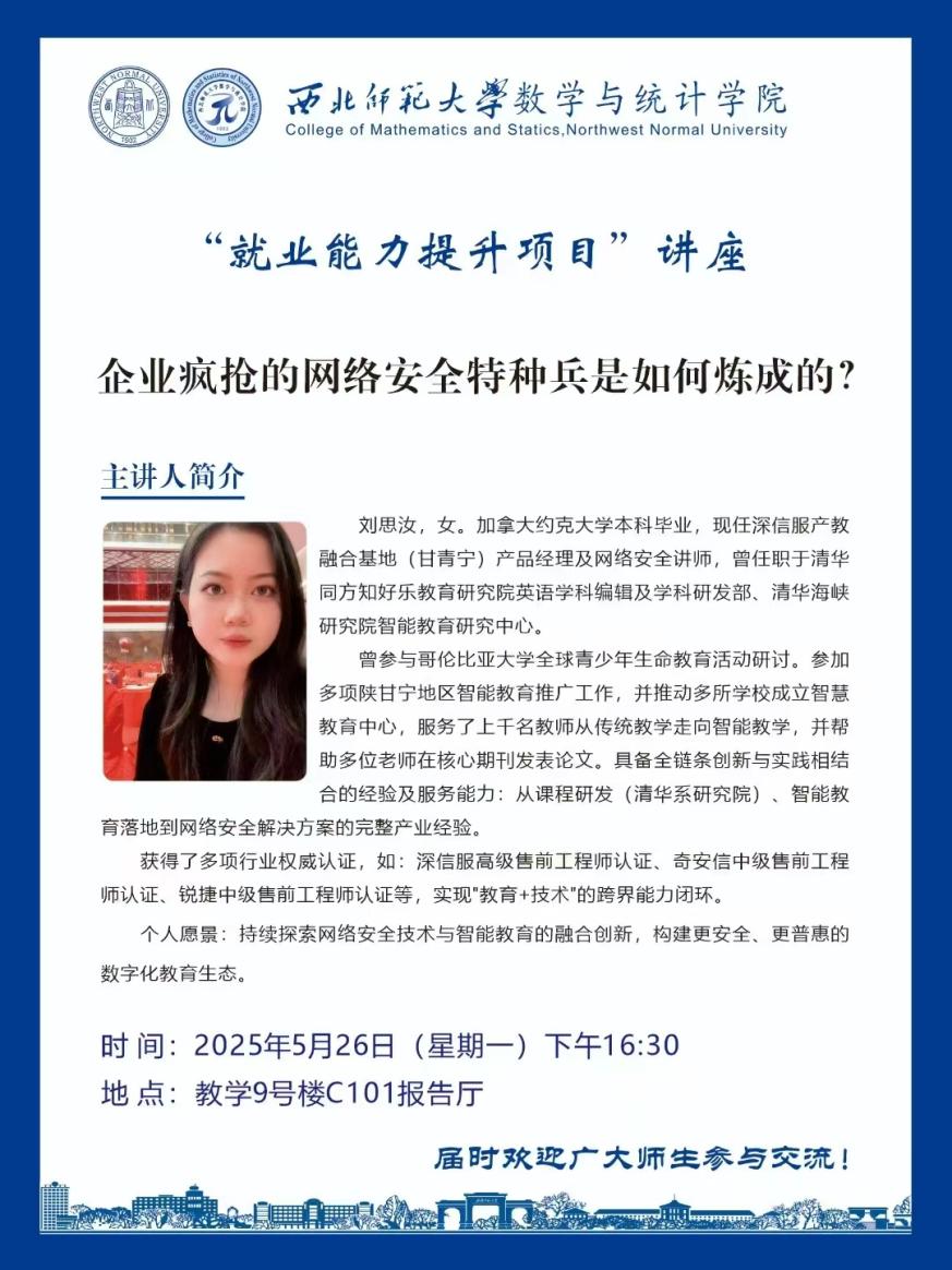 为了进一步激发学生职业生涯规划意识,提升就业能力。5月26日下午,学院在致勤楼C101报告厅举办了就业能力提升讲座,特邀深信服产教融合基地(甘青宁)产品经理及网络安全讲师刘思汝主讲。学院党委副书记张向东、辅导员周宇及2022级、2023级信息与计算科学专业50余名学生参会。