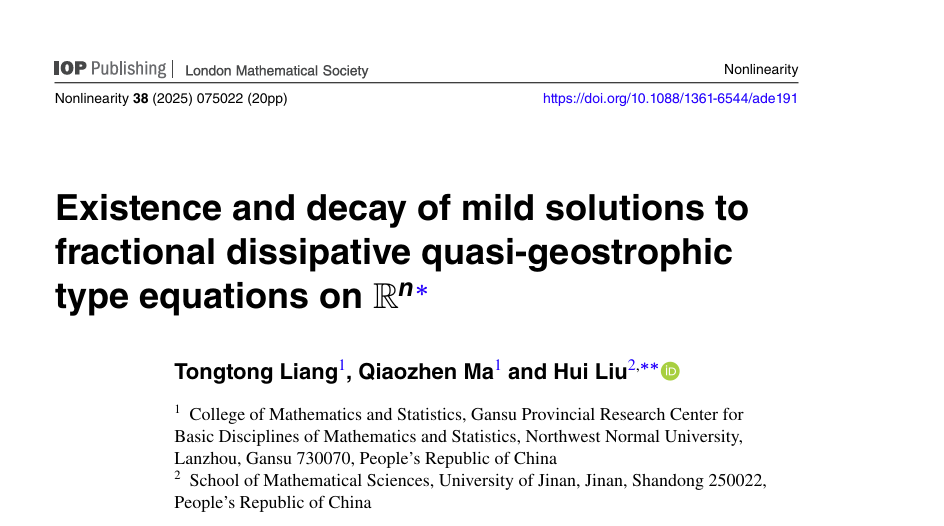 近日,我院教师梁彤彤博士与马巧珍教授及其合作者在国际权威期刊《Nonlinearity》(非线性)上发表了题为“Existence and decay of mild solutions to fractional dissipative quasi-geostrophic type equations on Rn”的高水平学术论文(论文链接: https://doi.org/10.1088/1361-6544/ade191),这是我校首次以第一署名单位在该刊物上发表学术论文。《Nonlinearity》由国际知名出版社IOP Publishing出版,其发文主题广泛涵盖物理、数学、工程和生物科学等多个非线性科学领域,是业内认可度极高的学术期刊,同时也是中国数学会数学领域高质量科技期刊分级目录中的T2类刊物。
