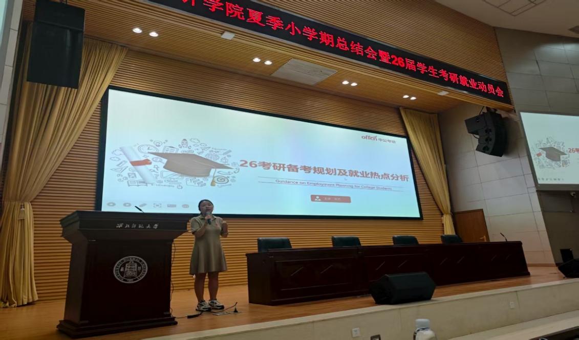 会议还邀请了中公考研甘肃分校研究院院长张艺老师作《2026年考研备考规划及就业热点分析》的报告,旨在帮助同学们精准锚定发展方向,锻造升学与职业双重竞争力,考研科学备考规划与策略,从考研就业角度结合国家战略新兴产业(AI、绿色、健康、制造、数字)的等热点与人才的需求,将考研选择与未来高潜力就业紧密结合,实现闭环发展,提升同学们的双重竞争力,助力其在竞争中胜出。