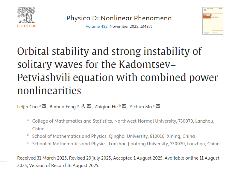 近日,我院冯斌华教授与2023级博士生曹磊金及其合作者在国际权威期刊《Physica D: Nonlinear Phenomena》上发表了题为 “Orbital stability and strong instability of solitary waves for the Kadomtsev-Petviashvili equation with combined power nonlinearities” 的高水平学术论文(论文链接:https://doi.org/10.1016/j.physd.2025.134875),这是我院首次以第一署名单位在该刊物上发表学术论文,也是我院近年来推行高质量培养研究生系列举措取得成效的具体体现。《Physica D: Nonlinear Phenomena》由国际知名出版社Elsevier 出版,其发文主题深刻聚焦于非线性现象的基础数学与物理原理,广泛涵盖波动、模式形成、混沌及复杂系统等多个核心前沿领域,是数学物理方向认可度极高的学术期刊,同时也是中国数学会数学领域高质量科技期刊分级目录中的T2类刊物。