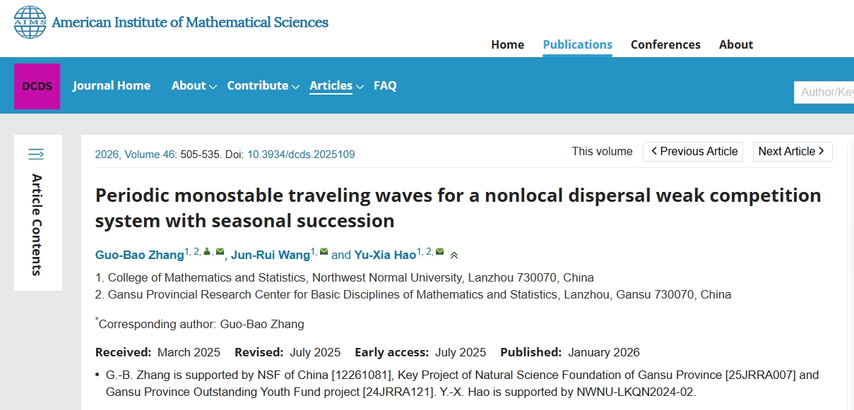 近日,我院张国宝教授与2022级硕士研究生王军蕊和青年教师郝玉霞在国际权威期刊《Discrete and Continuous Dynamical Systems》上发表了题为“Periodic monostable traveling waves for a nonlocal dispersal weak competition system with seasonal succession” 的高水平学术论文(论文链接:https://www.aimsciences.org/article/doi/10.3934/dcds.2025109)。这是我院近年来推行高质量培养研究生系列举措取得成效的具体体现。《Discrete and Continuous Dynamical Systems》是由美国数学科学研究所(AIMS)出版的数学期刊,主要刊载分析、微分方程和动力系统领域的理论、方法和应用的原创性论文,致力于记录该领域的重要新方法和成果,并保持高速创新和高质量标准,具有极高的学术声誉,同时也是中国数学会数学领域高质量科技期刊分级目录中的T2类刊物。