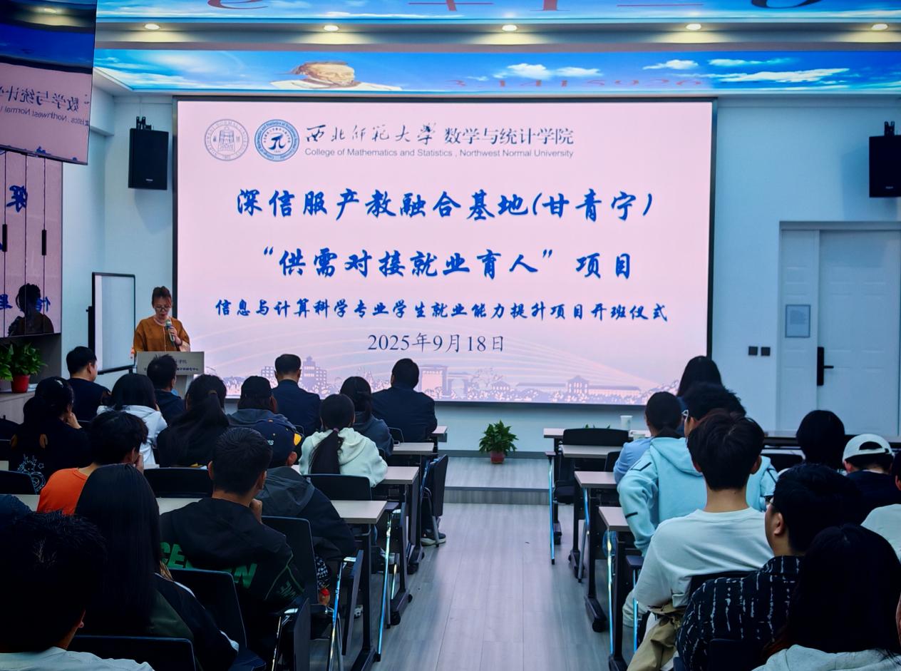 9月18日晚,学院与深信服产教融合基地(甘青宁)合作开展的“教育部供需对接就业育人”项目——信息与计算科学专业学生就业能力提升项目开班仪式在致勤楼D07报告厅举行。深信服西北大区产教融合业务总经理冯金凤、深信服产教融合基地产品经理刘思汝,学院副院长张国宝、党委副书记张向东、信计与统计系主任杨宏、专职辅导员包佳佳以及信息与计算科学专业学生参加。