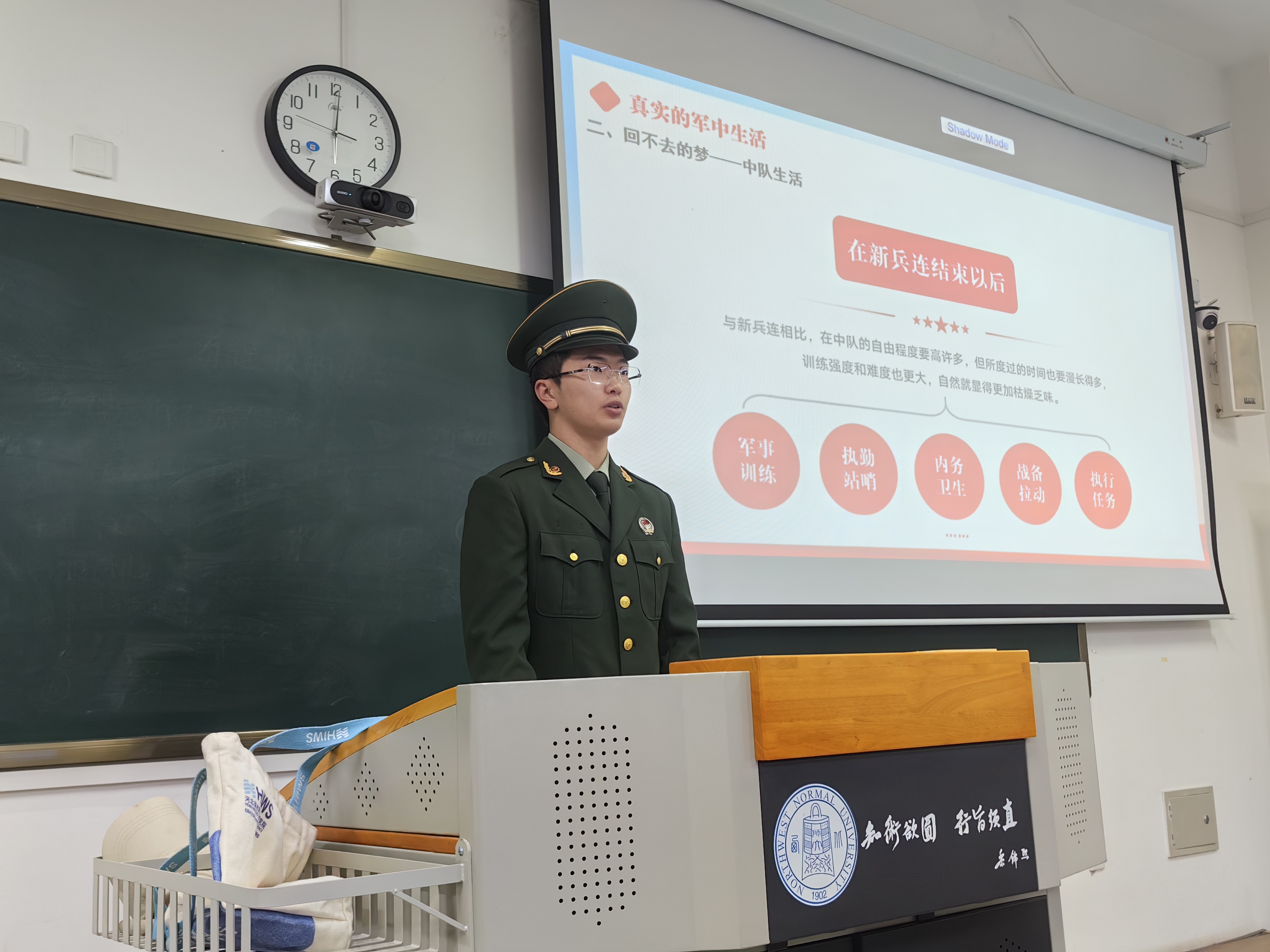 分享会上,2023级应数4班古丽阿依姆·如则、2024级应数1班冯超、2024级应数2班马亚蓉、2025级应数2班陈彤新等4名优秀退伍学生代表结合亲身经历,生动展现了从军营回到校园的蜕变历程。会上,4位优秀退伍大学生从为什么要参军、军营的日常生活、个人的体验、成长和收获、入伍应具备的条件等方面进行了分享。
