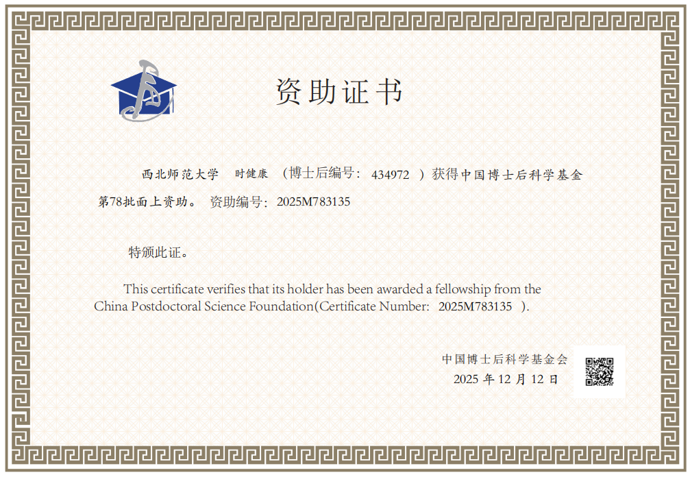 中国博士后科学基金会于2025年12月12日为我院师资博士后时健康颁发了中国博士后科学基金面上资助证书,这是近年来学院在博士后工作领域取得的又一项重要成果。2025年度,我院数学博士后流动站共有1位博士后顺利出站,同时新进站博士后2位。