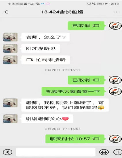 “时空里不能和学生见面交流,那就在‘云端’见面和交流吧。”2018级数学与应用数学3班班主任李晓燕老师与学生们温暖相守,“我真觉得学生就像自己的孩子,封闭管理期间见不到还想呢,所以和在校的每个宿舍每位同学都进行了视频交流,当看到他们脸上的笑容时,我心里也是格外开心。”李老师对于有困惑和困难的学生,通过“云端”给予及时帮助,比如有位同学某天晚上给发信息说她出疹子了买不到药,李老师立即和辅导员联系,按着正常程序让学生顺利就医。